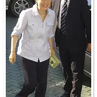 얼굴 가득 웃음을 머금고 ,깃을 세운 브라우스에 가는 목걸이를 하고 오른손엔 연설 원고를 접어 들고있습니다.