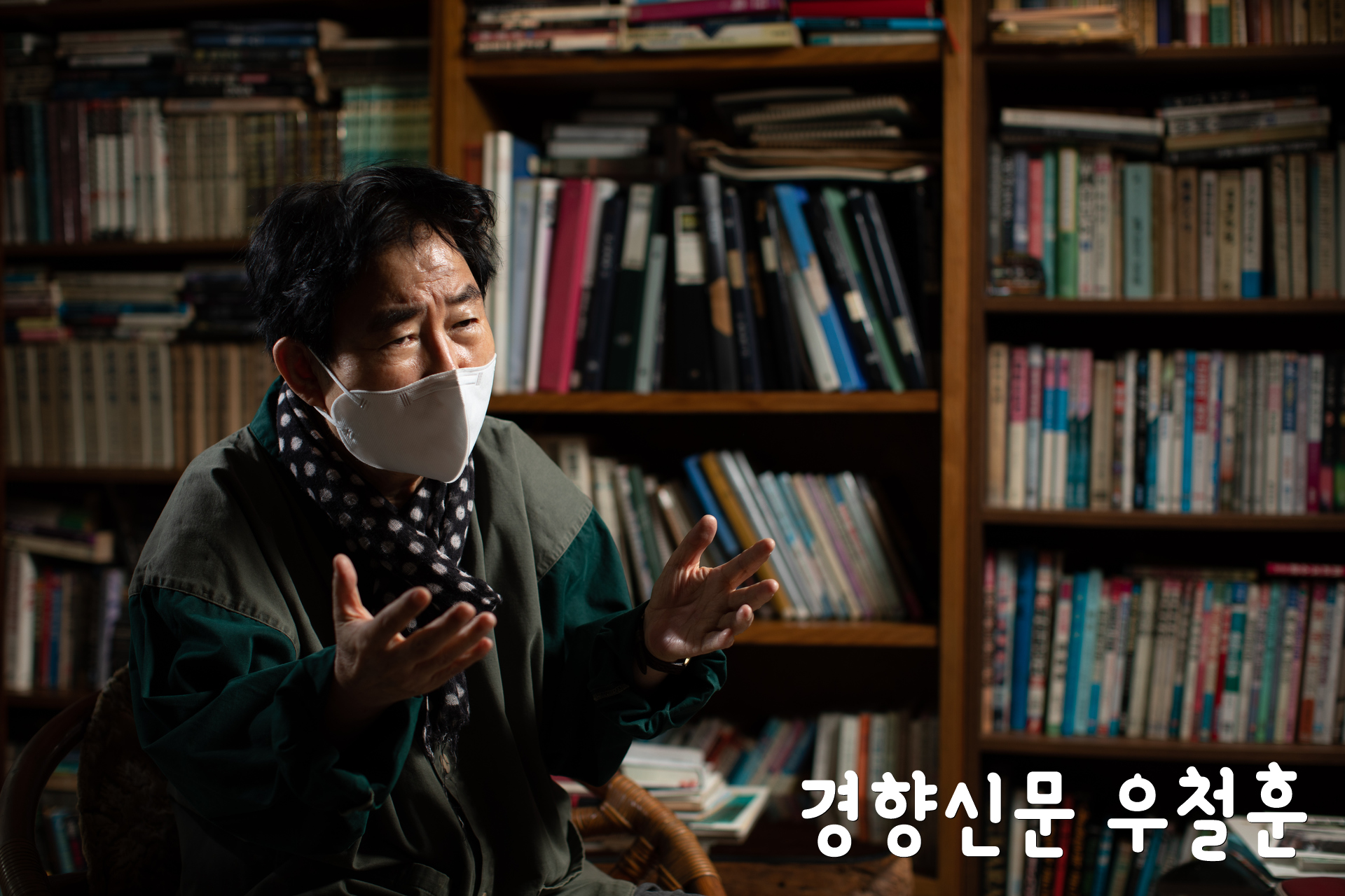 배경의 책장에 그라데이션이 생겼습니다. 배경을 어둡게 떨구고 그라데이션을 주고 하는 것은 보는 사람들의 시선이 인터뷰를 하고있는 사람에게 더 집중되게 하기 위해서 입니다. 열정적으로 이야기 하시는 선생님의 얼굴과 손모양이 배경과 분리되서 더 또렷하게 보입니다.
